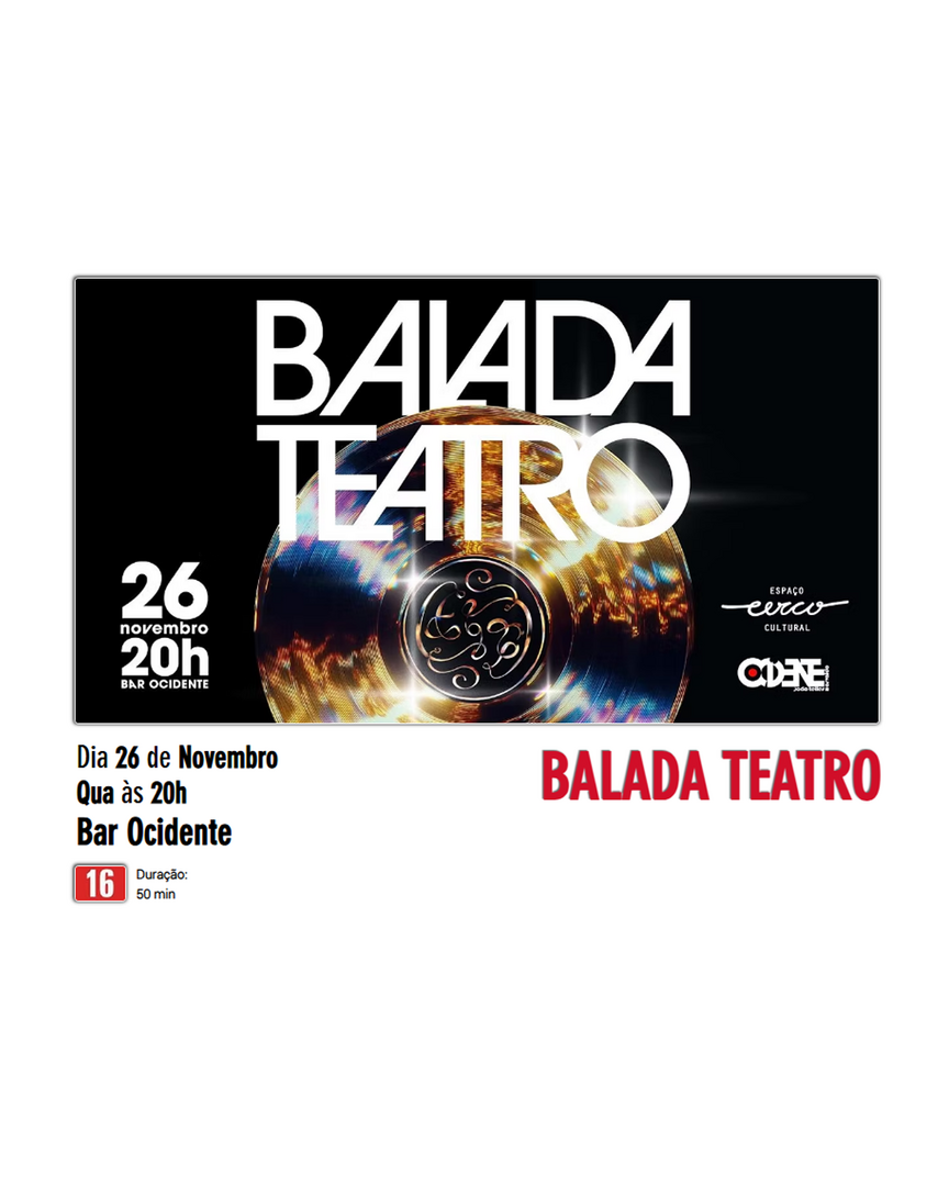 Balada Teatro é um convite para uma viagem pelas noites. Juntos, percorreremos uma pista que se transforma em palco e um palco que se transforma em pista, tudo junto e misturado. Guiados pelo ritmo da música e dos corpos que pulsam, o convite é para um encontro, uma celebração entre balada e teatro. Onde começa um e termina o outro?