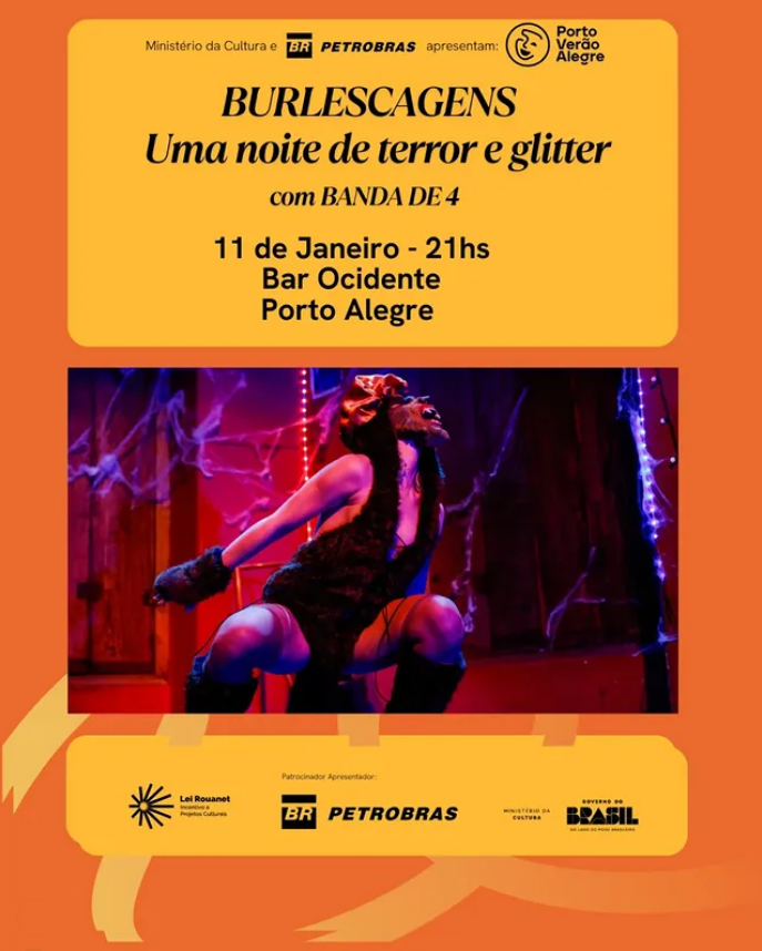 SINOPSE: É show, é teatro, é cabaré! BURLESCAGENS – Uma Noite de Terror e Glitter é um espetáculo burlesco de variedades que mistura humor, sensualidade e referências clássicas do horror. Quando a noite cai, criaturas das sombras, acompanhadas ao vivo pela maligna Banda de 4, zombam do medo, brincam com desejo e se despem sem pudor. Uma experiência deliciosamente assustadora com performances que embaralham risos e arrepios com toques de assombro. O medo nunca foi tão gostoso — aqui tudo pode acontecer!